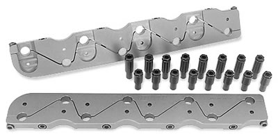 Dart stud girdles can help to improve the performance and reliability of engines equipped with stud-mounted rocker arms. Extra-long adjusting nuts are tightly clamped between rigid aluminum bars that prevent stud deflection under high loads. The valve motion more closely follows cam profile, producing more power and reducing breakage. Unlike universal girdles, these valvetrain stabilizers are designed to fit the specific valve locations, valve angles, and valve lengths in Dart cylinder heads. These kits include hardened poly-lock adjusting nuts.